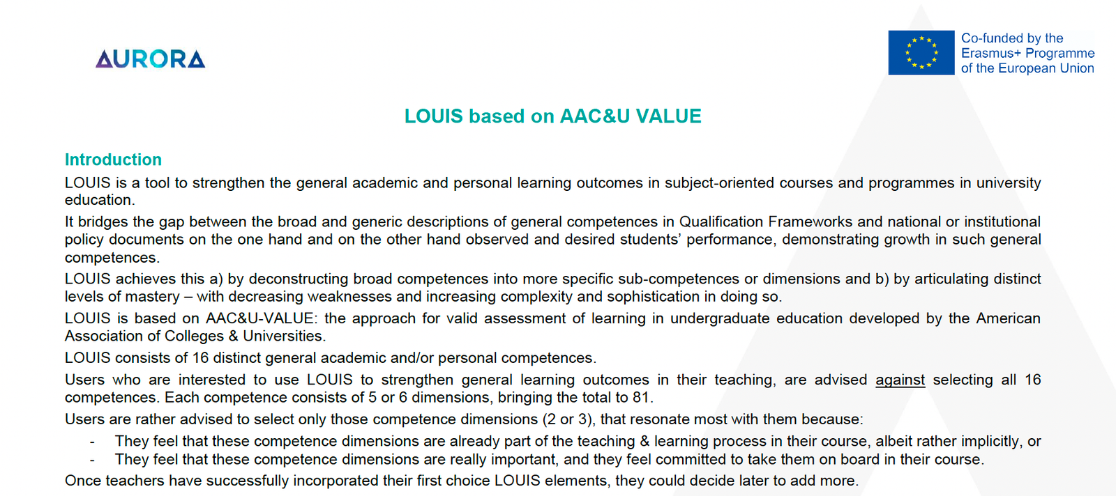 A tool from the Aurora Universities Network for assessing 16 general academic and personal competences (e.g., critical thinking, civic engagement). Based on AAC&U VALUE rubrics.